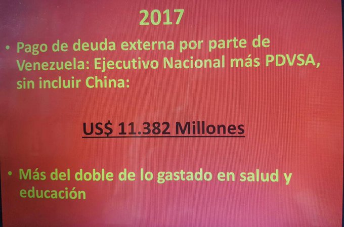 “Más del doble de lo gastado en salud y educación”, reitera la lámina mostrada por Guerra y cuya cifra no incluye los compromisos que Venezuela debe cumplir con China.